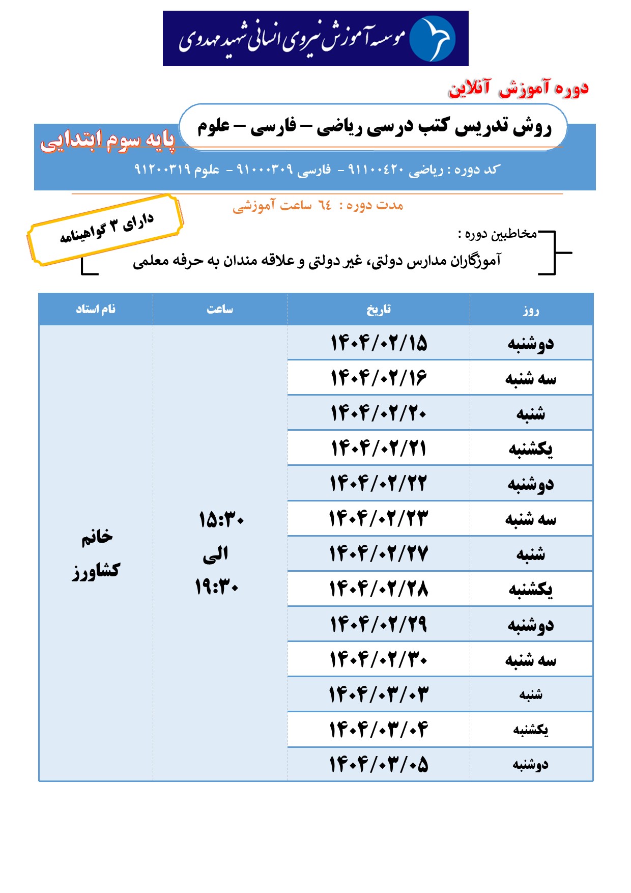 زمانبندی: از 26 مهر الی 7 آبان 1404 بصورت آنلاین از ساعت 15 الی 19
